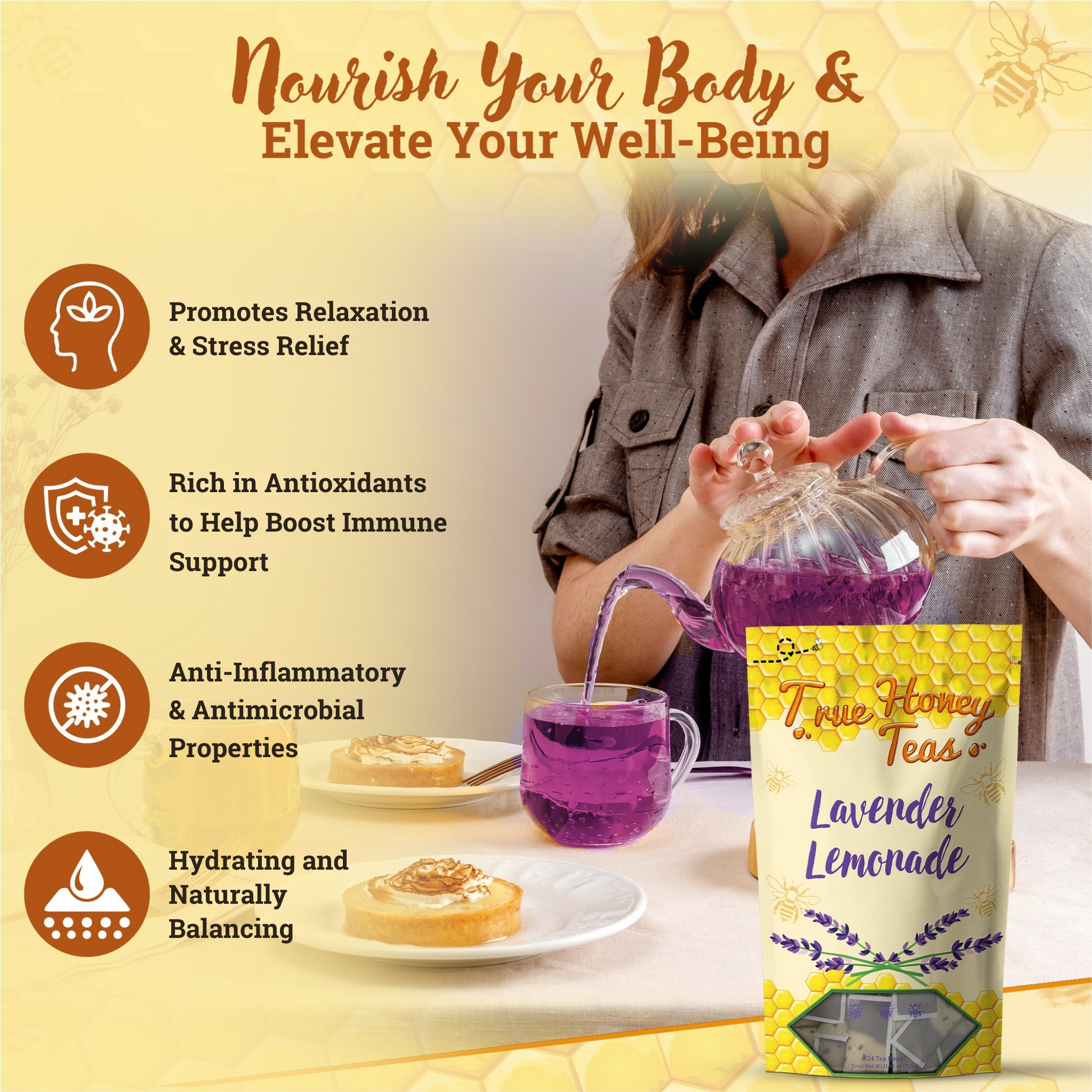True Honey Teas unique herbal Lavender Lemonade is our most popular flavor that brilliantly balances lavender from France, lemon myrtle from Australia, a little bit of hibiscus, with honey granules! Lemon myrtle has immense health benefits and our blend is quite exquisite, delicious, calming. Enjoy each healthy cup - iced or hot - relaxing for mind, body and spirit. Naturally caffeine free.