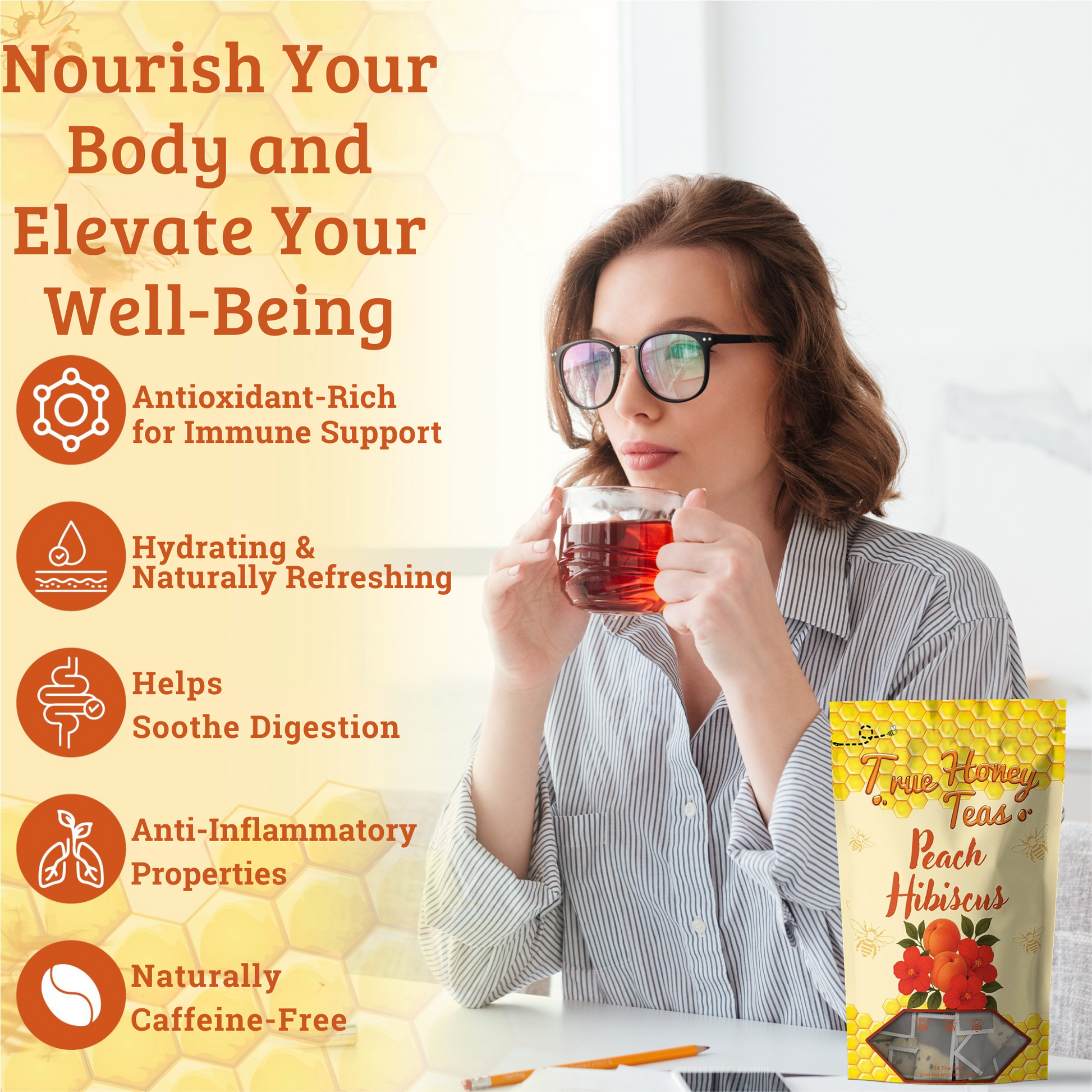 This vibrant blend pairs the juicy sweetness of peach with the bold, tart notes of hibiscus petals. The result is a fruity, refreshing cup with a naturally sweet finish from real honey granules. Delicious hot or iced, it’s a bright escape in every sip.